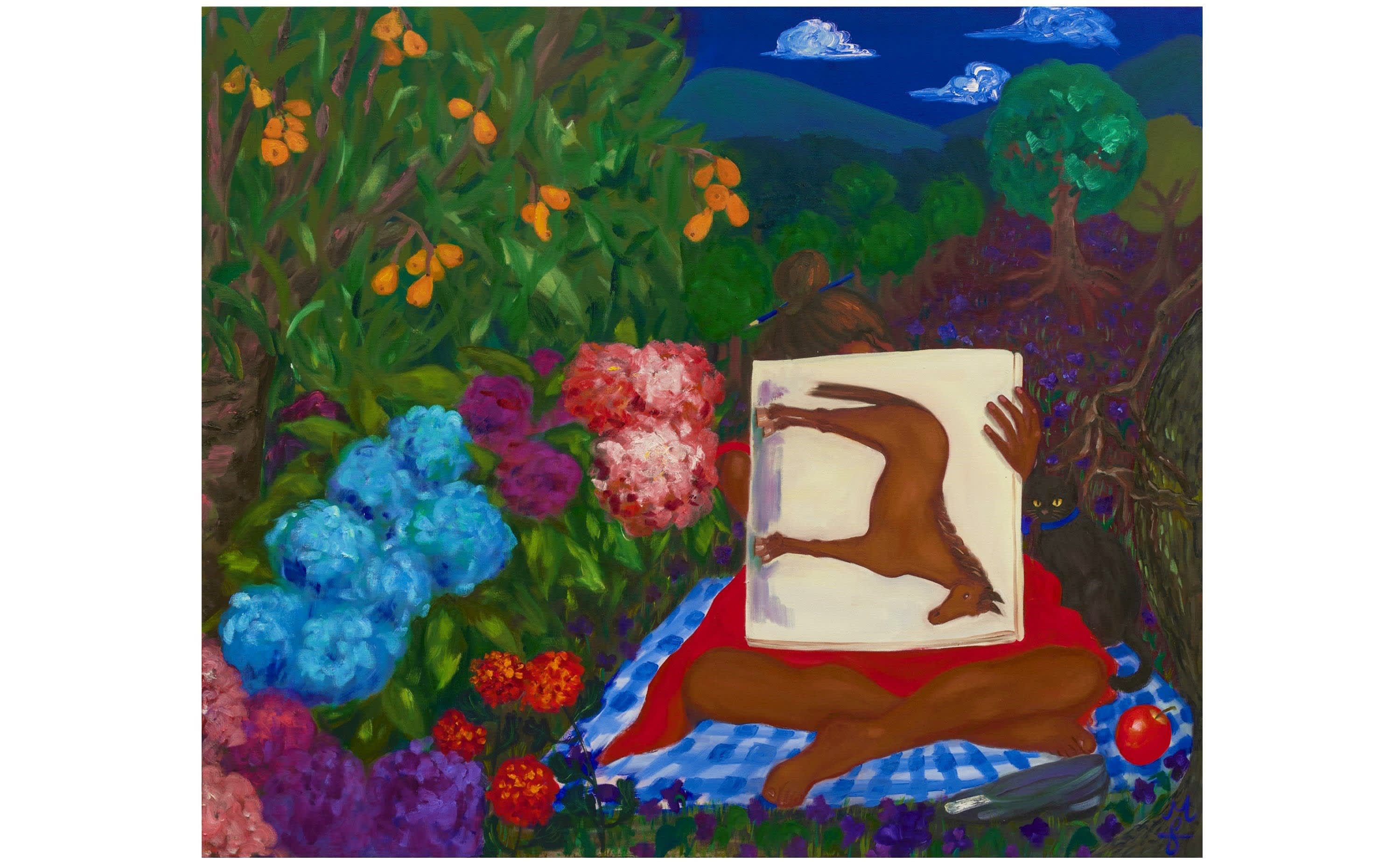 Another highlight of the exhibition is a series of garden paintings titled Brunnera, Hydrangeas and Sunflower. In these paintings, Farrar turns to details as she layers fine brush marks that depicts living plants and organisms commonly observed in nature. While exploring natural landscapes, she “looked at gardens in Botticelli’s Primavera, Lucas Cranach’s Gardens of Eden, and looked inwards to the garden of [her] childhood home in Shimonoseki.” Inspiration for this series came while Farrar was listening to a radio interview. A man who had recovered from coronavirus had spoken passionately about a recovery garden and a large inner courtyard of a hospital filled with plants and flowers that represented a place of hope and peace.